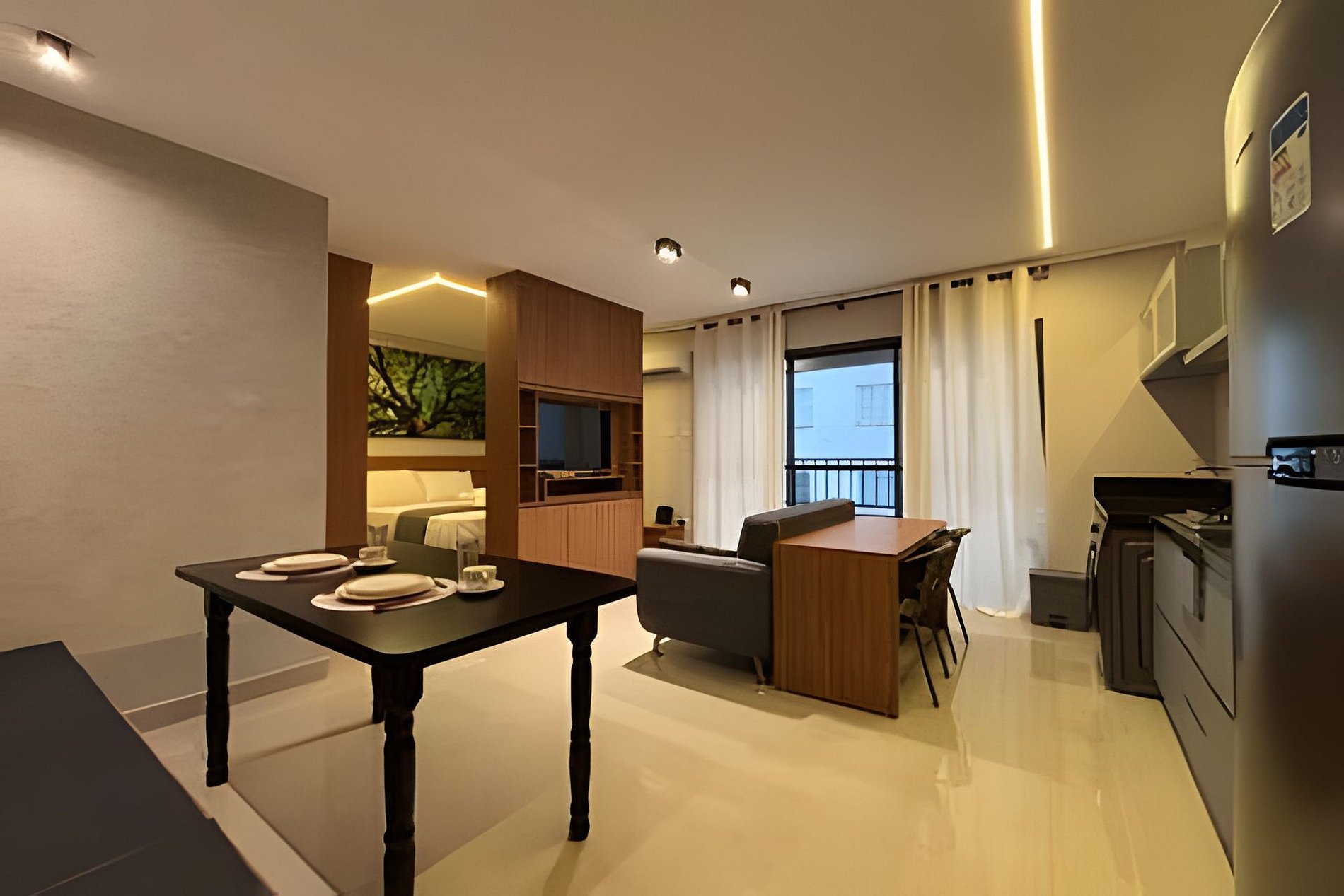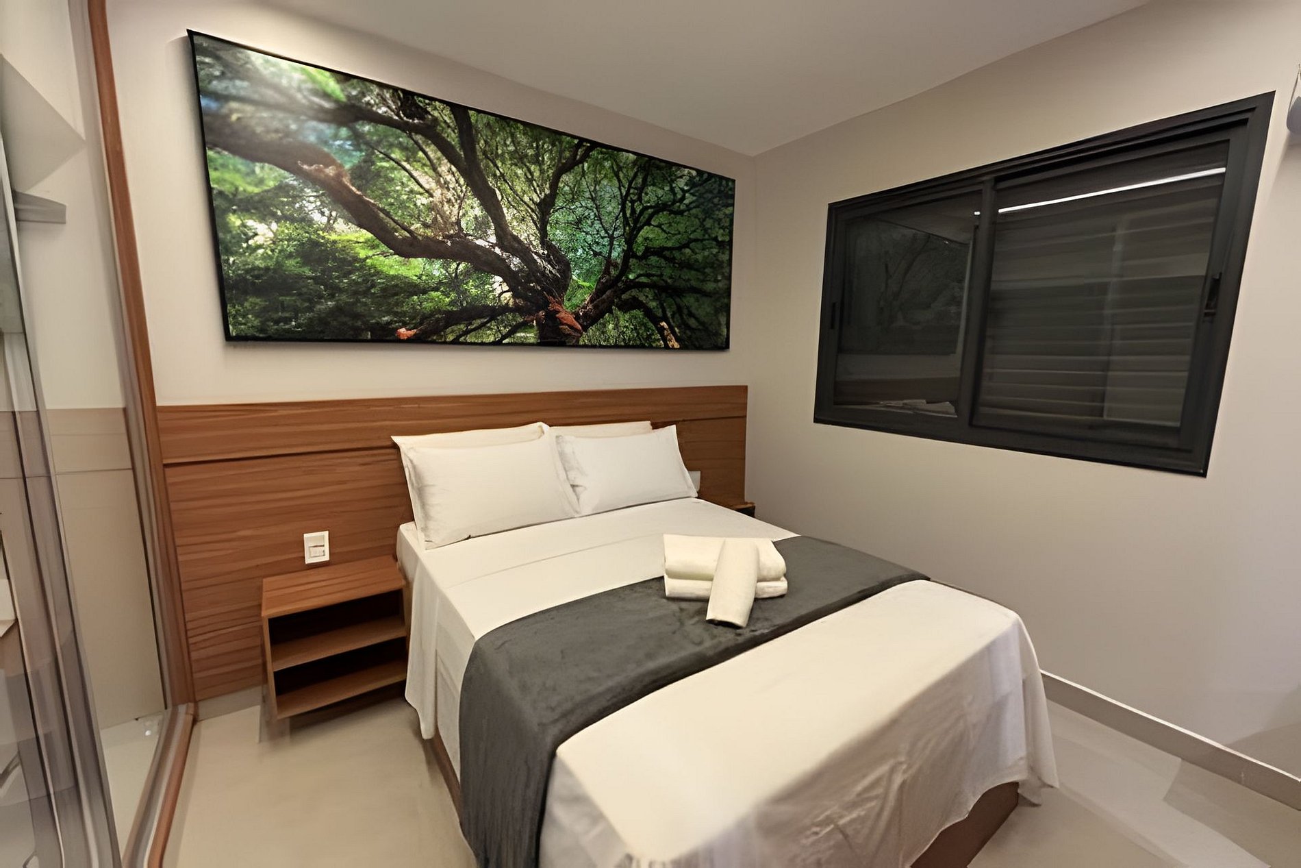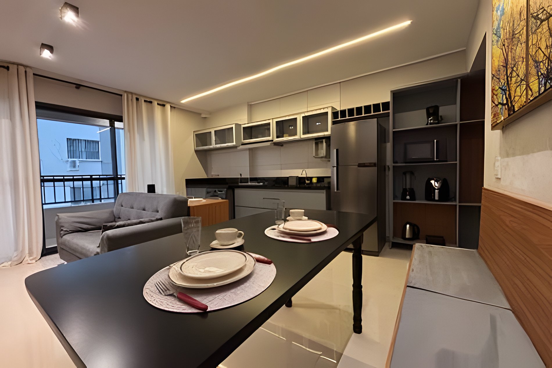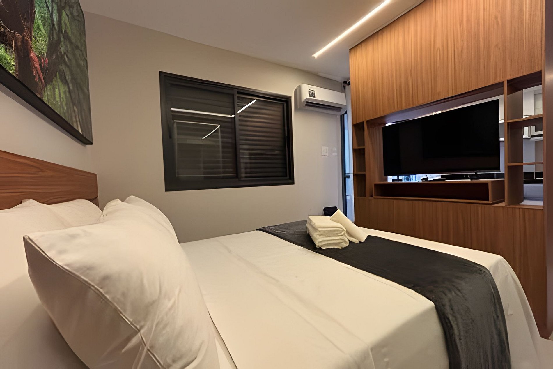 Flat amplo, alto padrão com Varanda. Cama Casal padrão, Wi-Fi exclusivo 700mb e ar-condicionado. Cozinha totalmente equipada e Máquina de Lavar roupas.