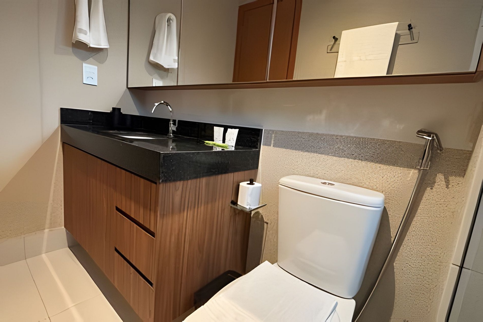 Ferro de passar roupa e Secador de cabelo. Chuveiro 7.800w e Ducha higiênica.