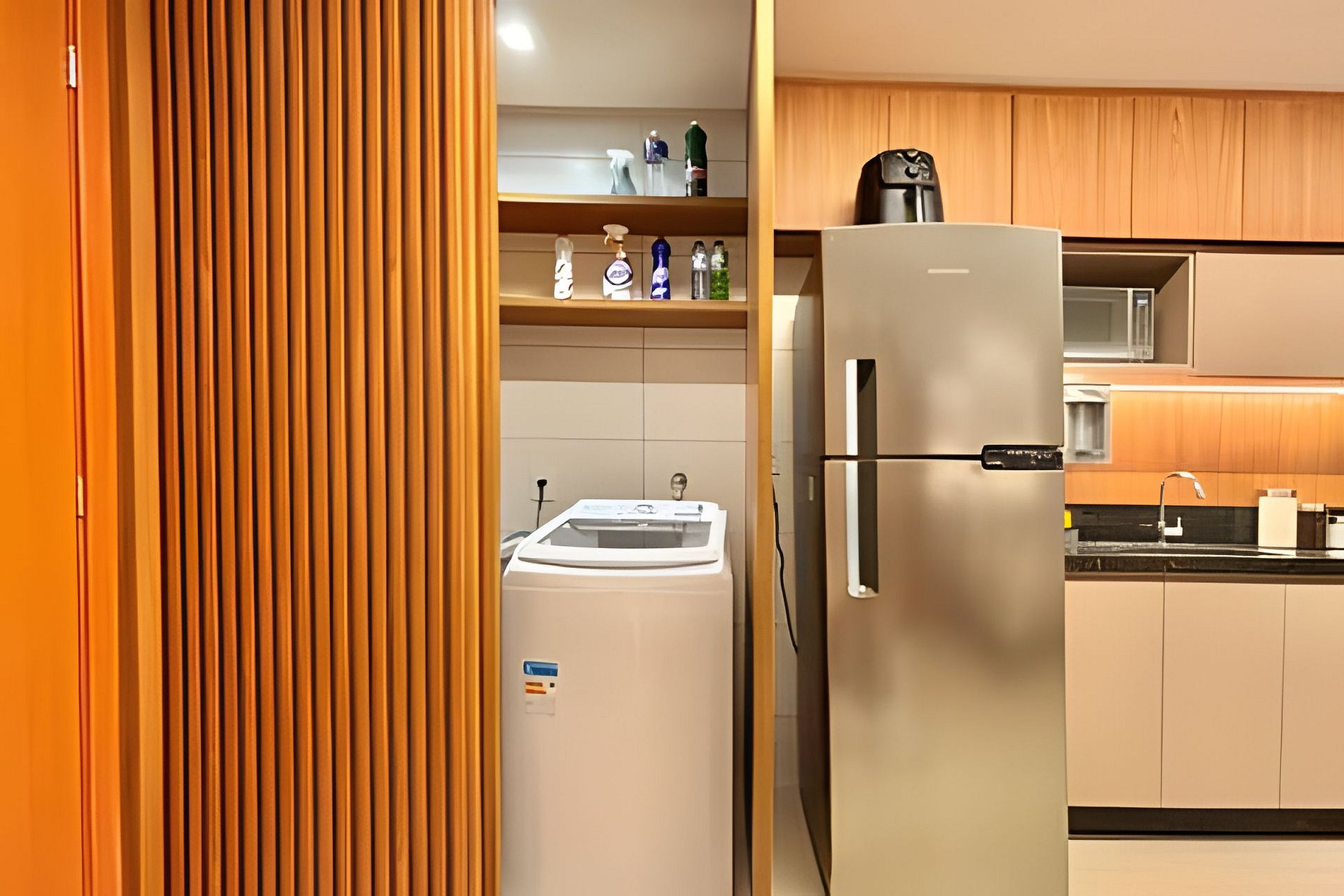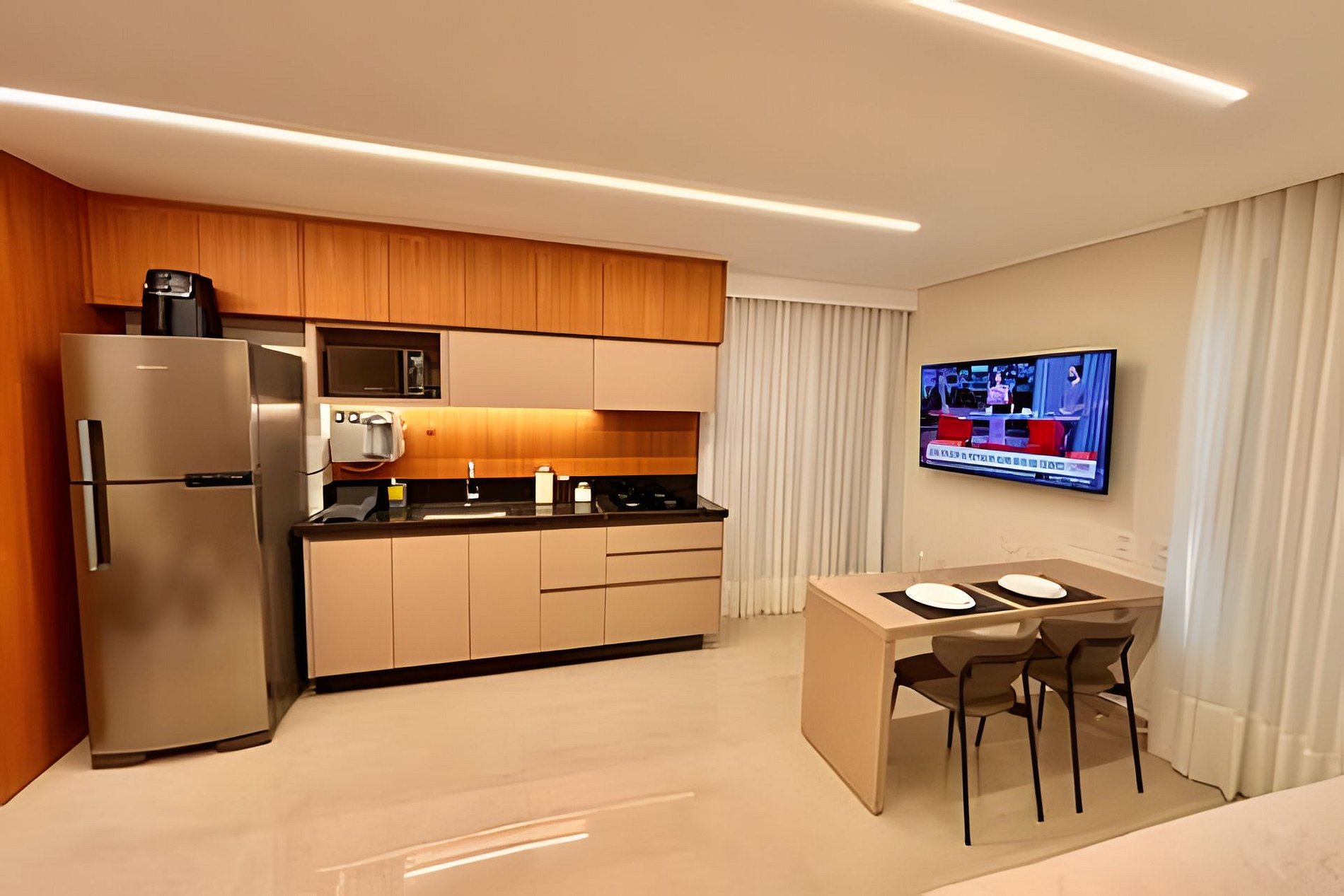 Cozinha completa com fogão, Micro-ondas, Geladeira, Filtro de água gelada, Liquidificador, Cafeteira, Sanduicheira, Air Fryer. Copos, Taças de vinho, Pratos, Talheres, Panelas e outros utensílios.