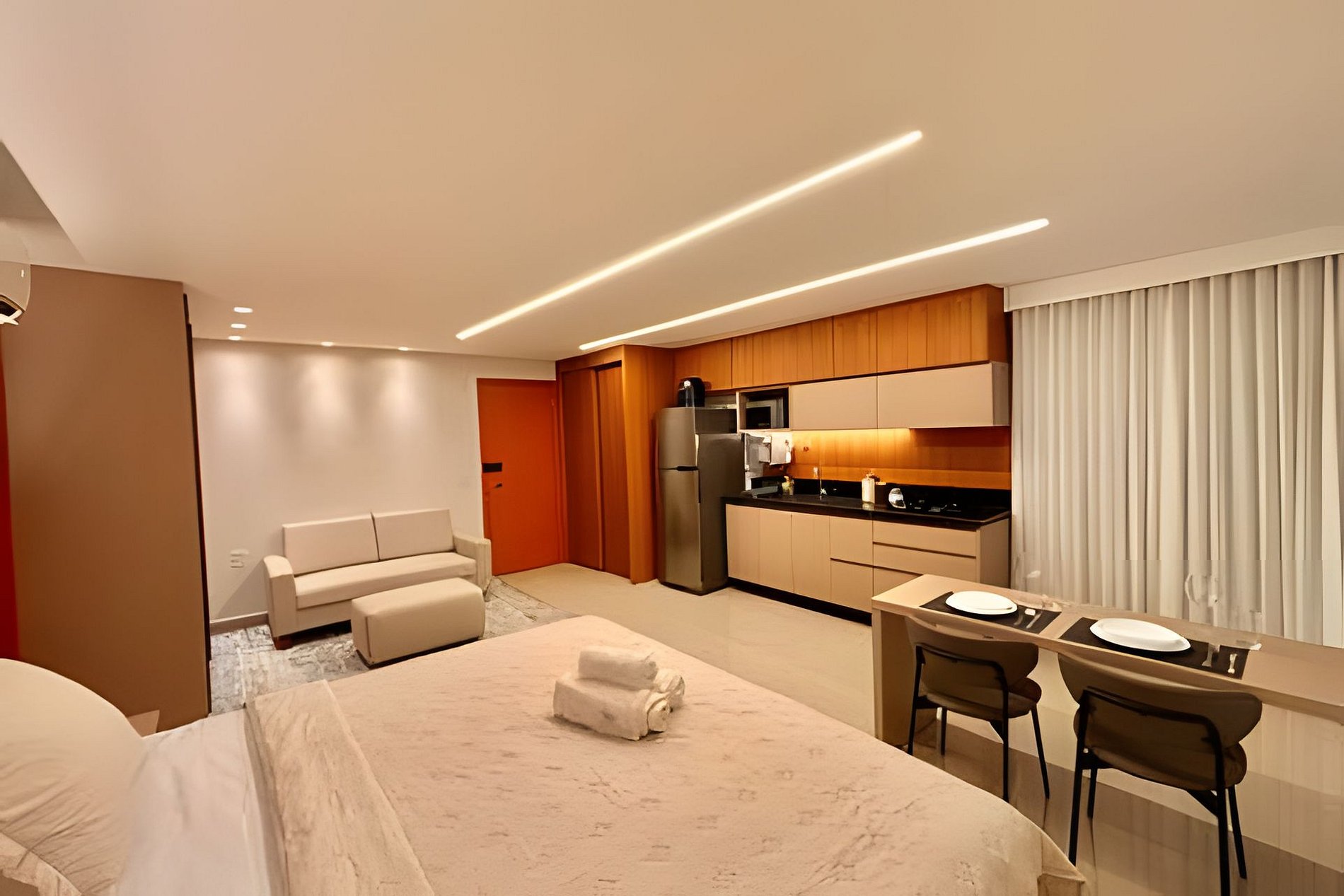 Flat amplo com cama SuperKing, alto padrão com Varanda espaçosa. Wi-Fi exclusivo 700mb e ar-condicionado. Cozinha totalmente equipada e Máquina de Lavar roupas.
