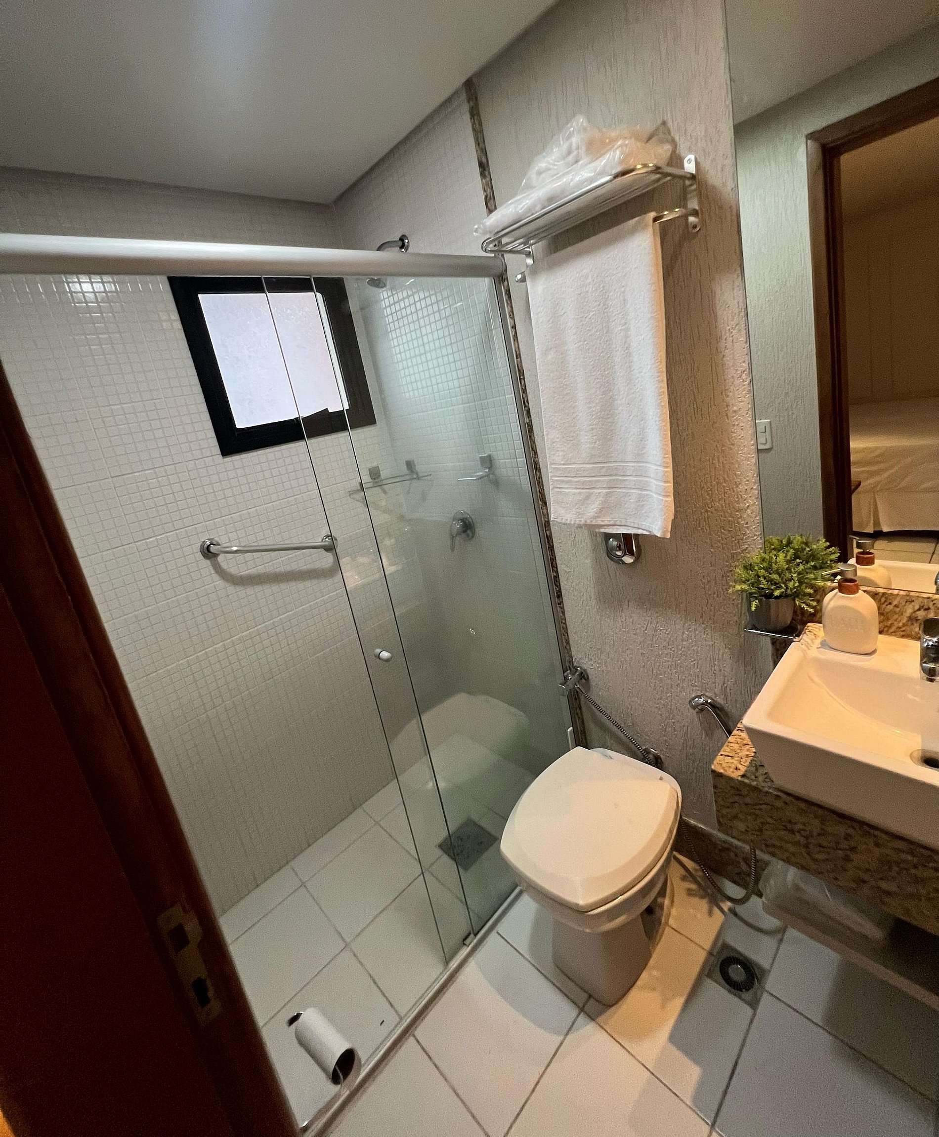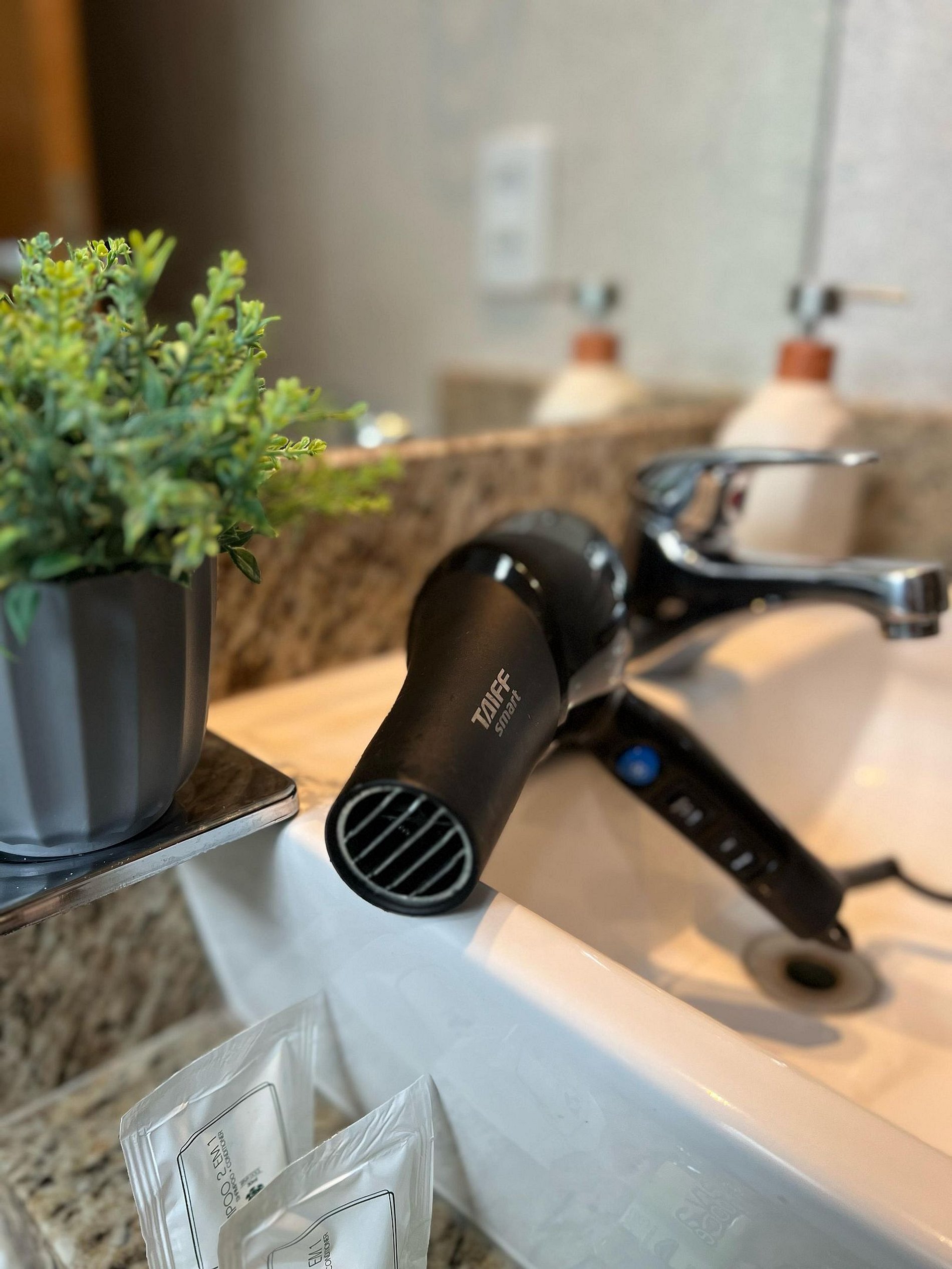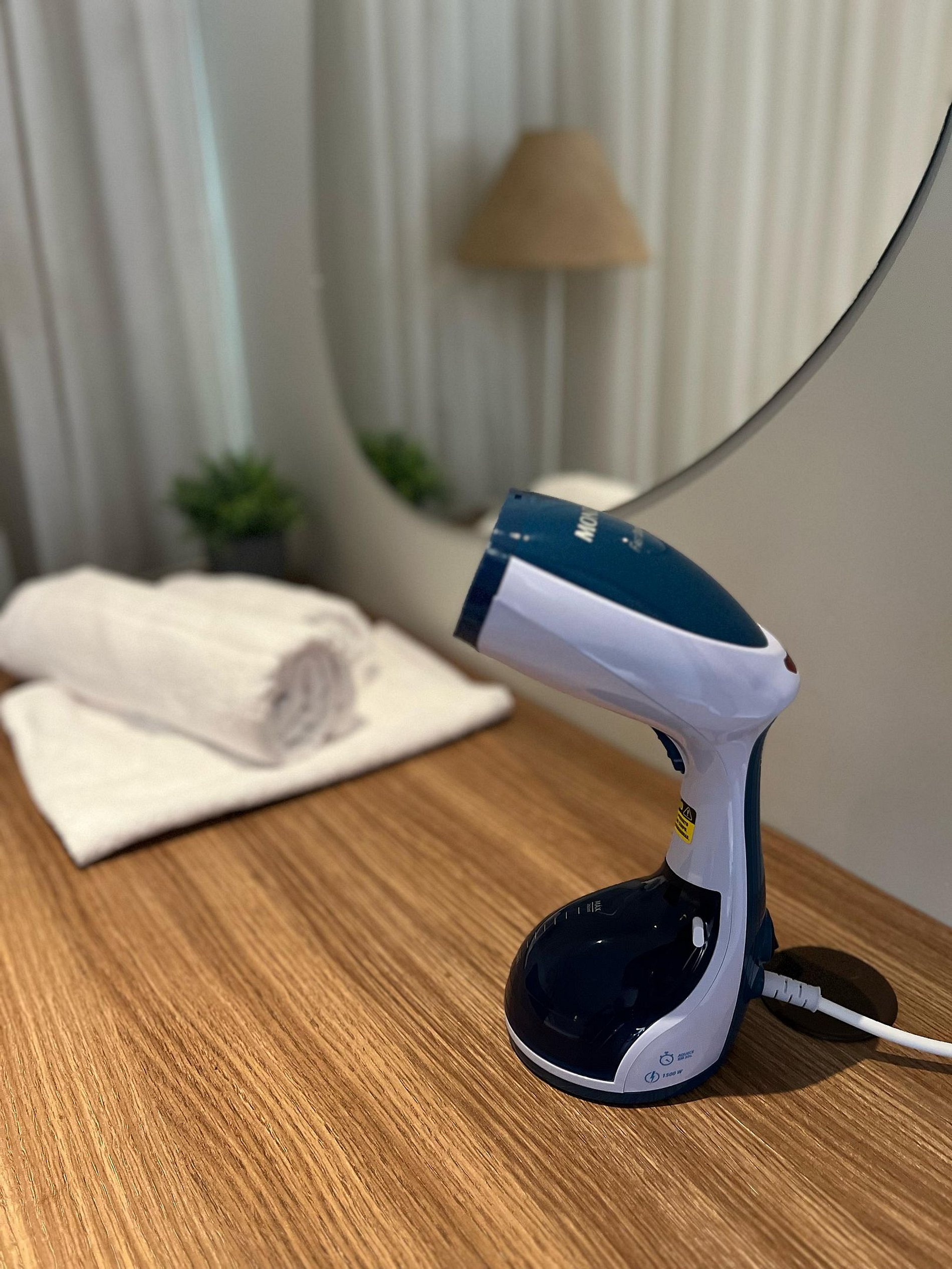 Steamer a vapor passar roupa e Secador de cabelo. Banheiro com Ducha direcionável e ducha higiênica.