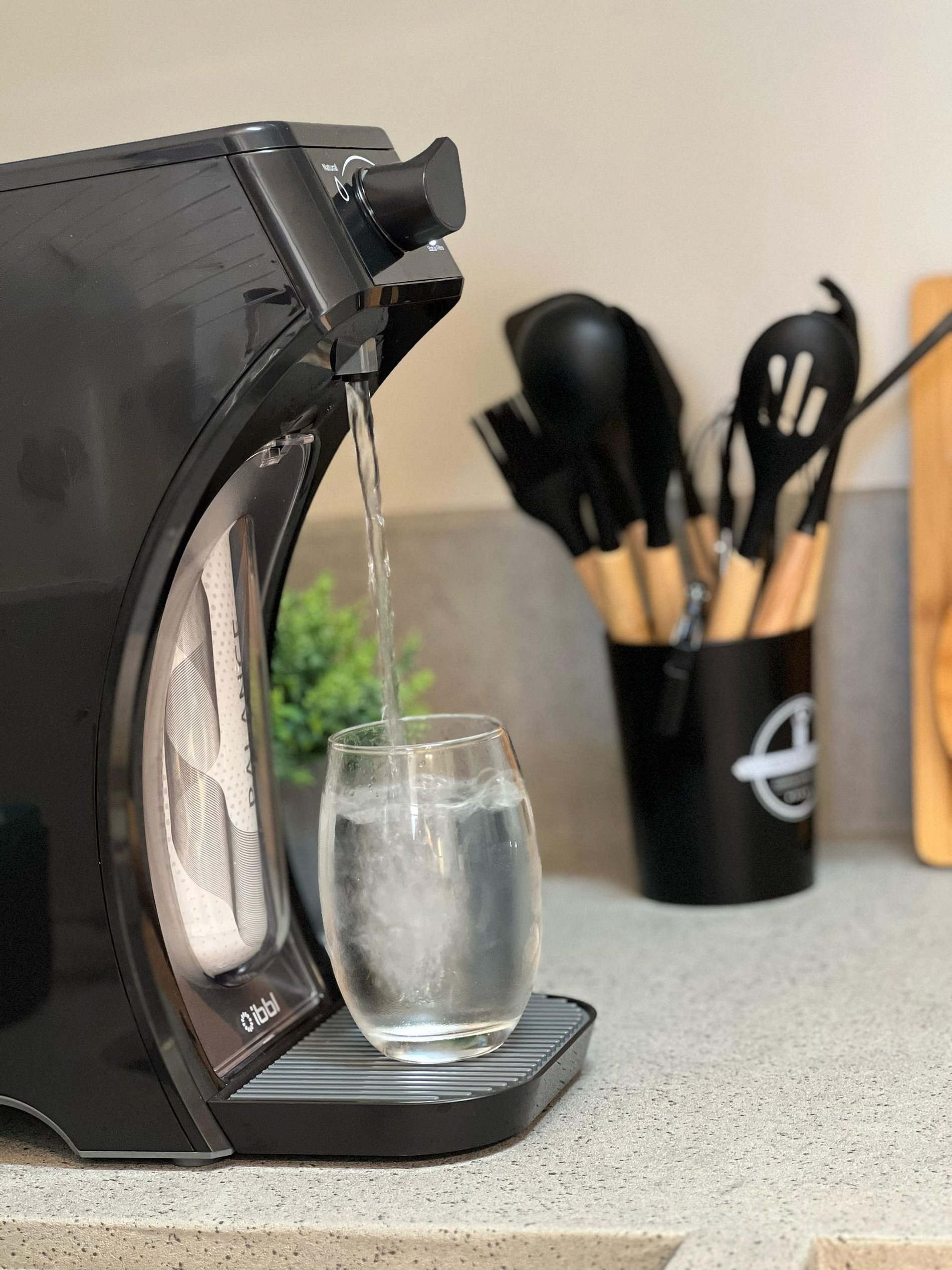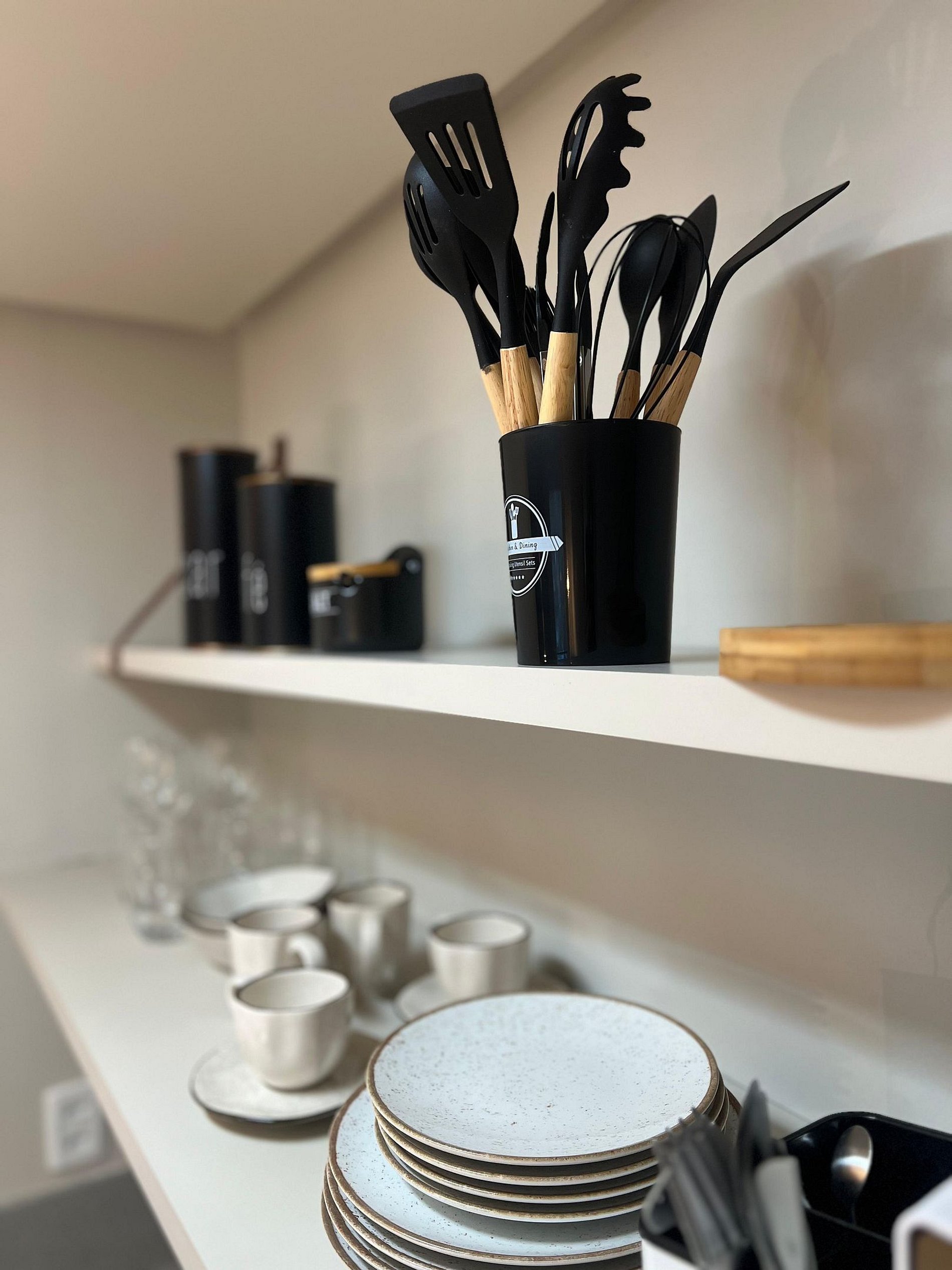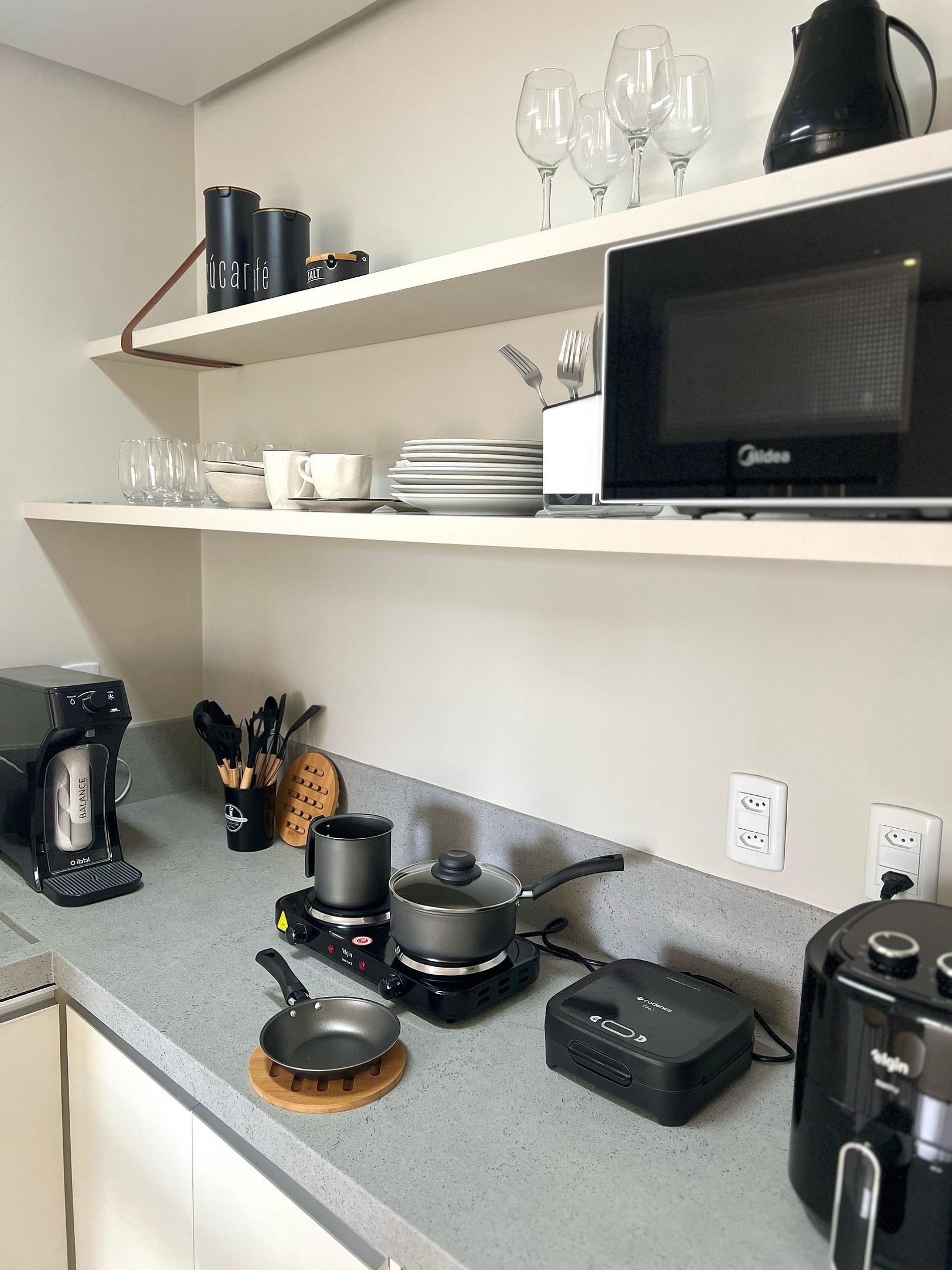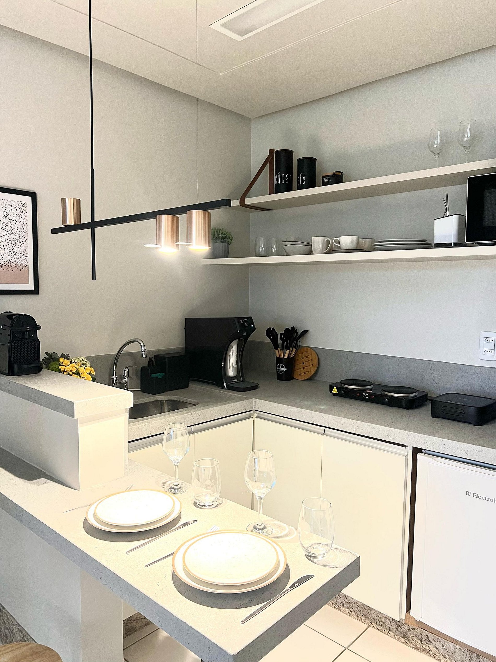 Cozinha compacta completa com fogão de bancada elétrico, Micro-ondas, Frigobar, Filtro de água gelada, Cafeteira, Máquina Nespresso, Sanduicheira. Copos, Taças de vinho, Pratos, Talheres, Panelas e outros utensílios.